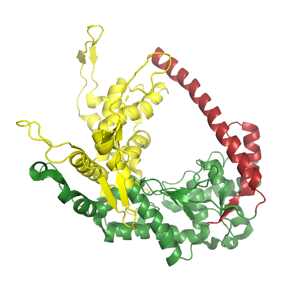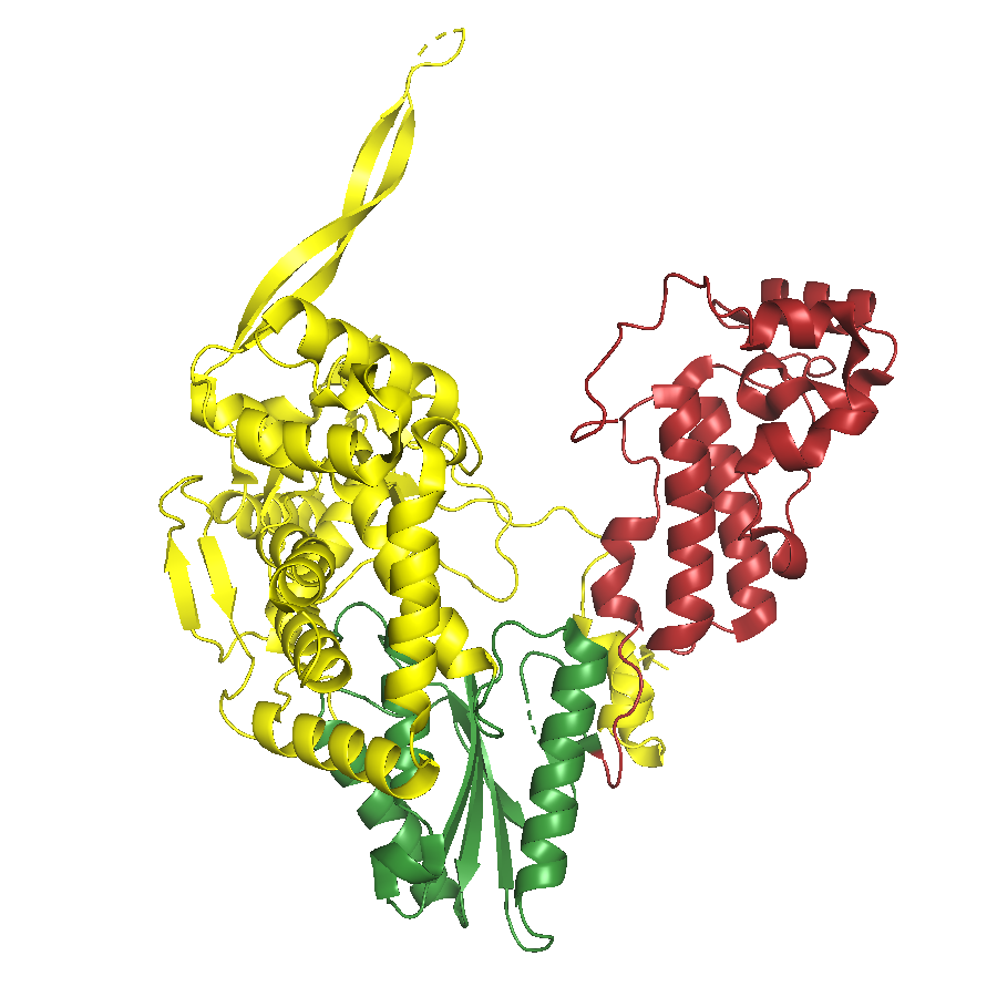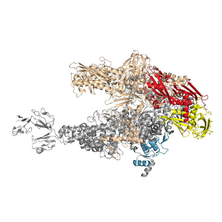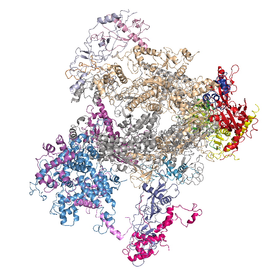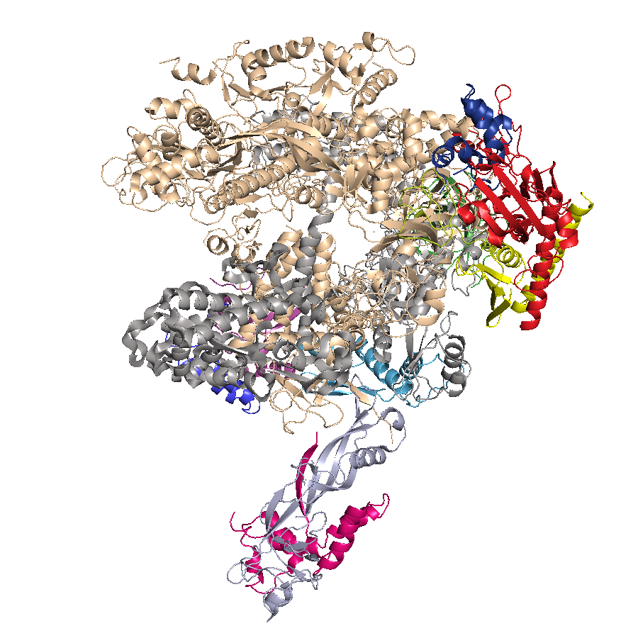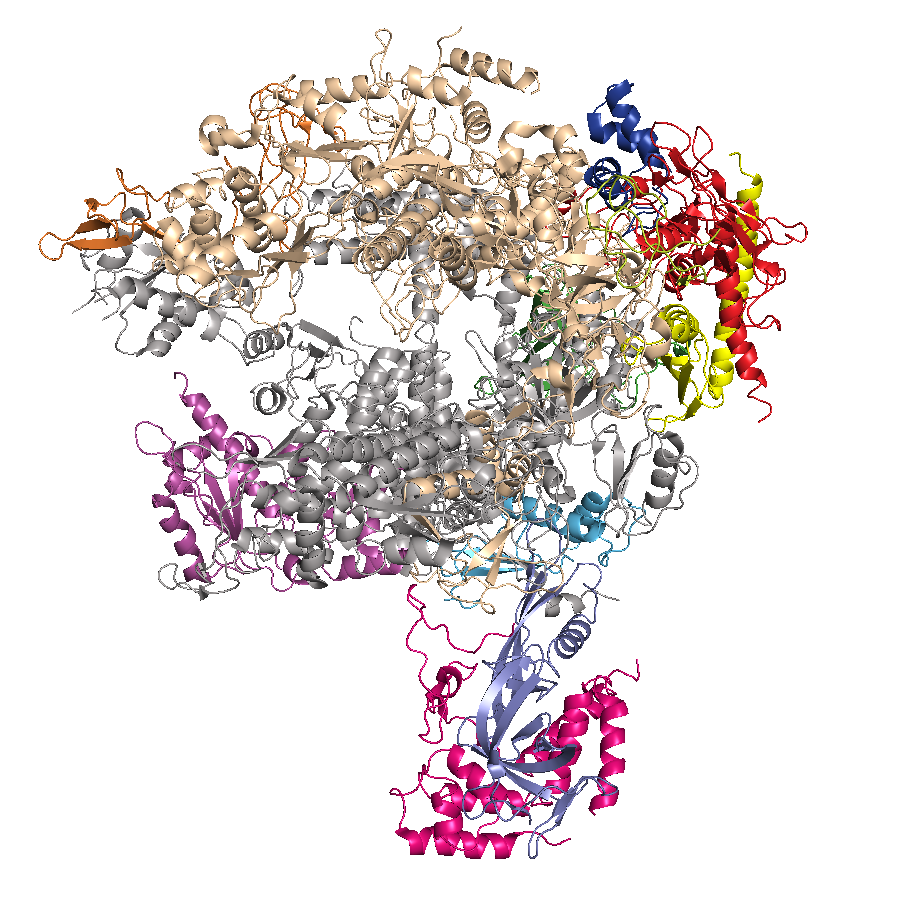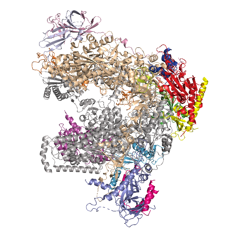 Structure of multisubunit RNA polymerase are shown. Same color represents homologous subunits