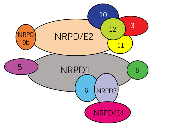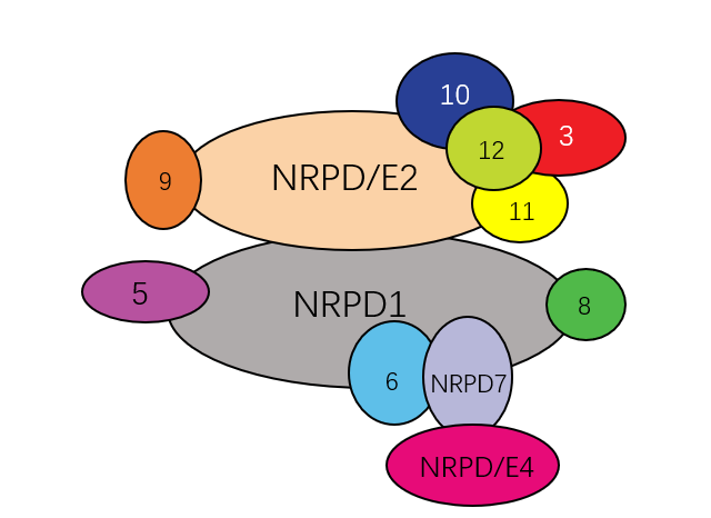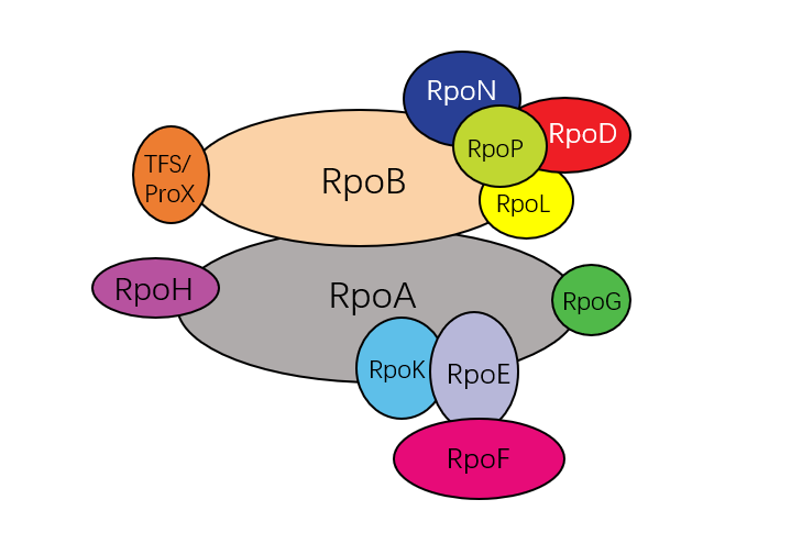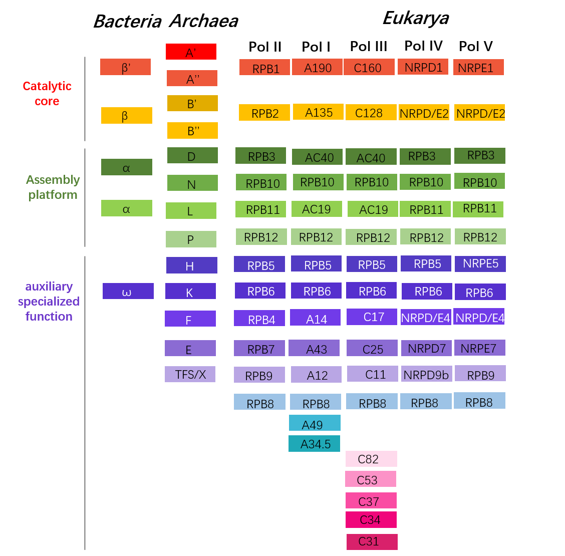 Subunit alignment table of multi-subunit RNA polymerase is shown, same color represents homologous subunits. Generally, the RNA core polymerase of prokaryotes contains 5 subunits, the RNA polymerase of archeae has 13 subunits, and there are three main types of eukaryotic RNA polymerases: RNAPI (14 subunits), RNAPII (12 subunits) subunits) and RNAPIII (17 subunits).