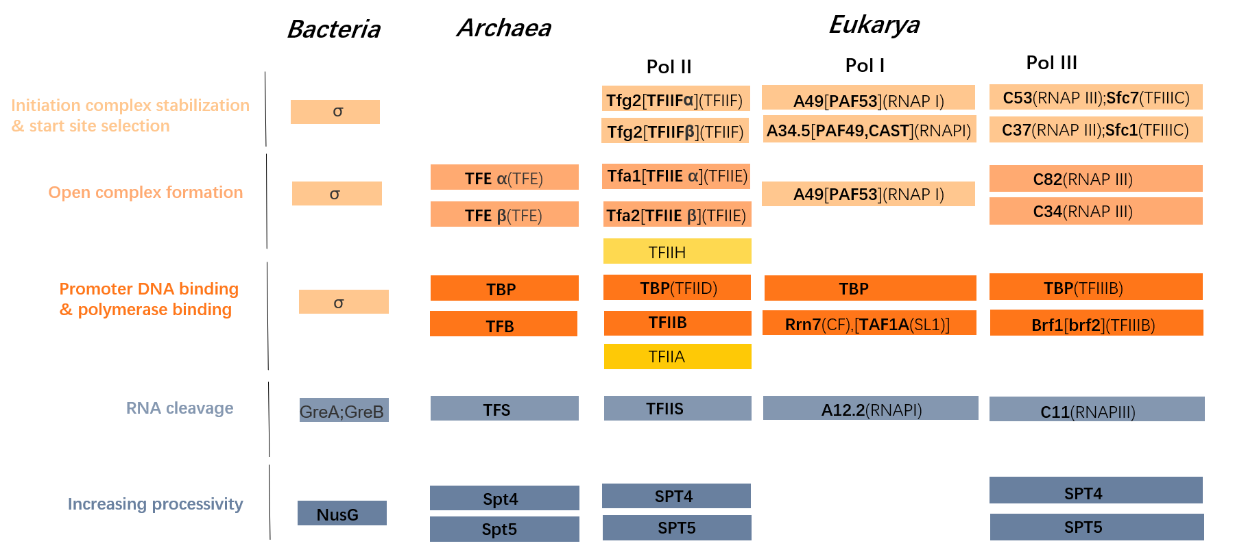 Table of transcription factors for multisubunit RNA polymerases is shown. Same color represents homologous transcription factors.