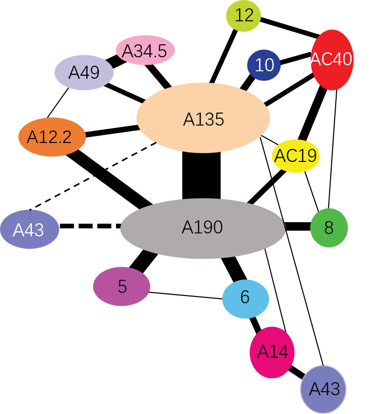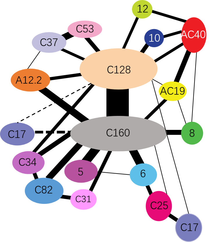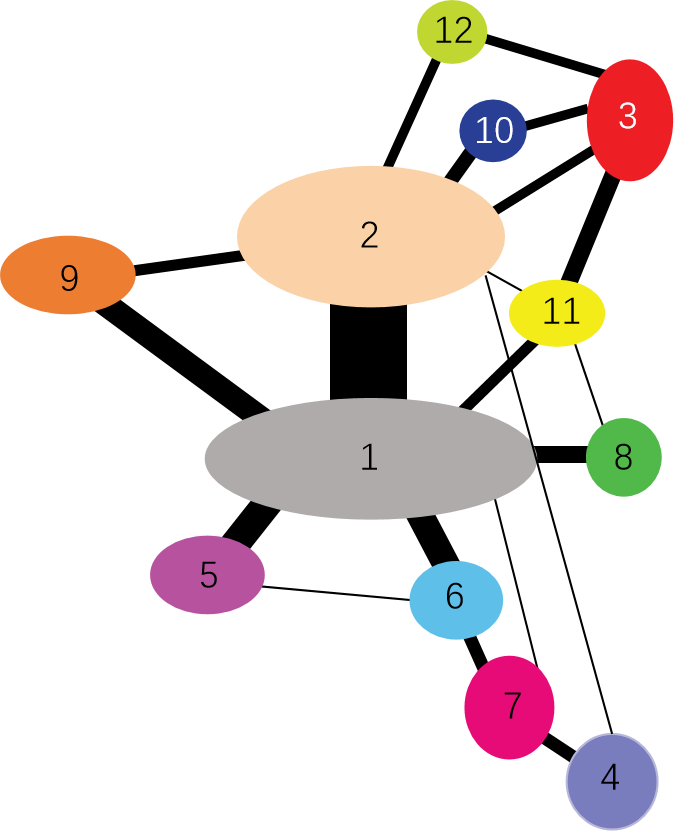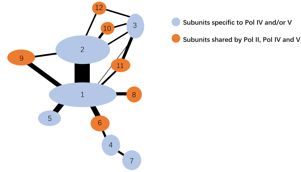 Interactions between subunits of eukaryotic RNA polymerases are shown. The thickness of the black line represents the strength of the subunit interaction.