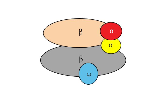 The relative positions of subunits of multisubunit RNA polymerase are shown. Same colors represent homologous subunits.