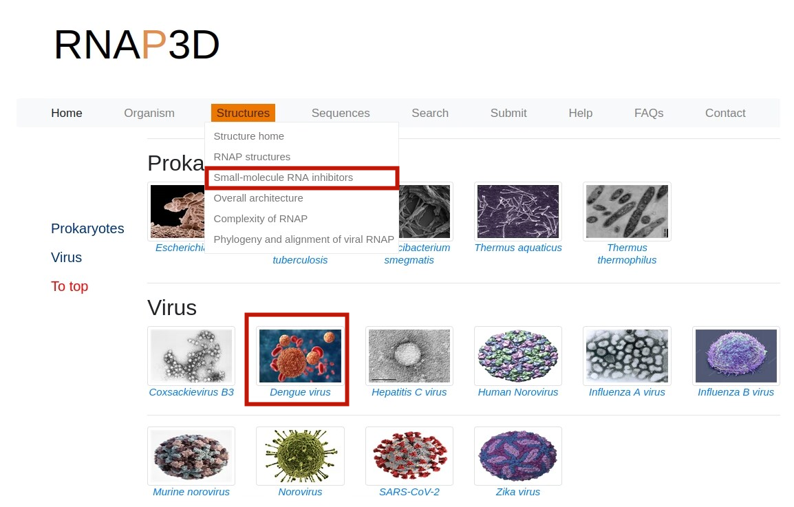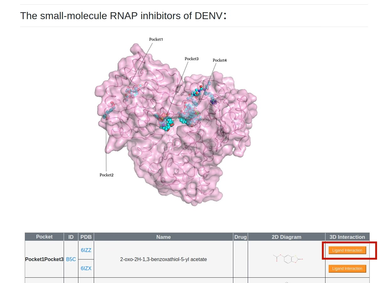 2.Browse by organism.On the “mall-molecule RNA inhibitors” page,users can browse the database by clicking the species image of interest.Users can select the organisms of interest to view all its inhibitors, and click the Ligands interaction button to view the interactions of inhibitors in proteins.The ID and PDB are linked to relative pages in PDB.