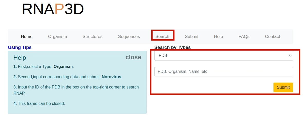 1.To browse the detailed information of any specific RNAP, users can specify the organism,PDB, name and so on in "Search" page.