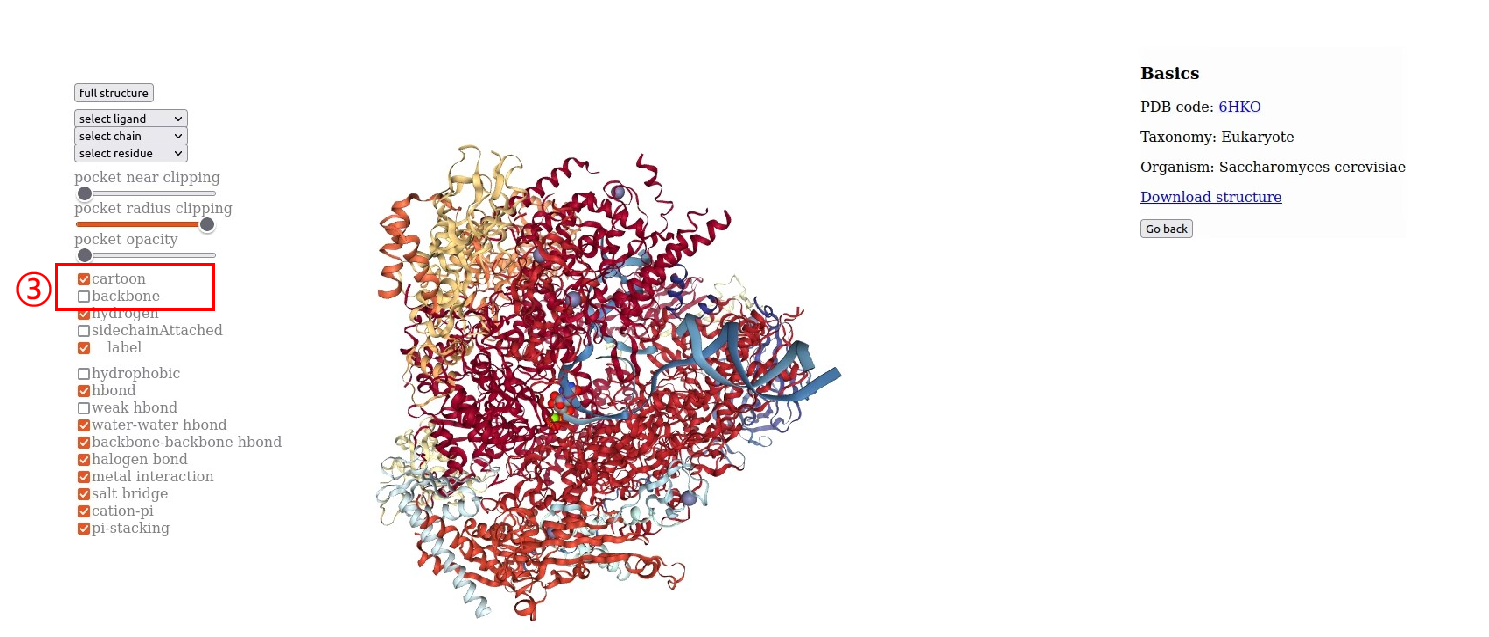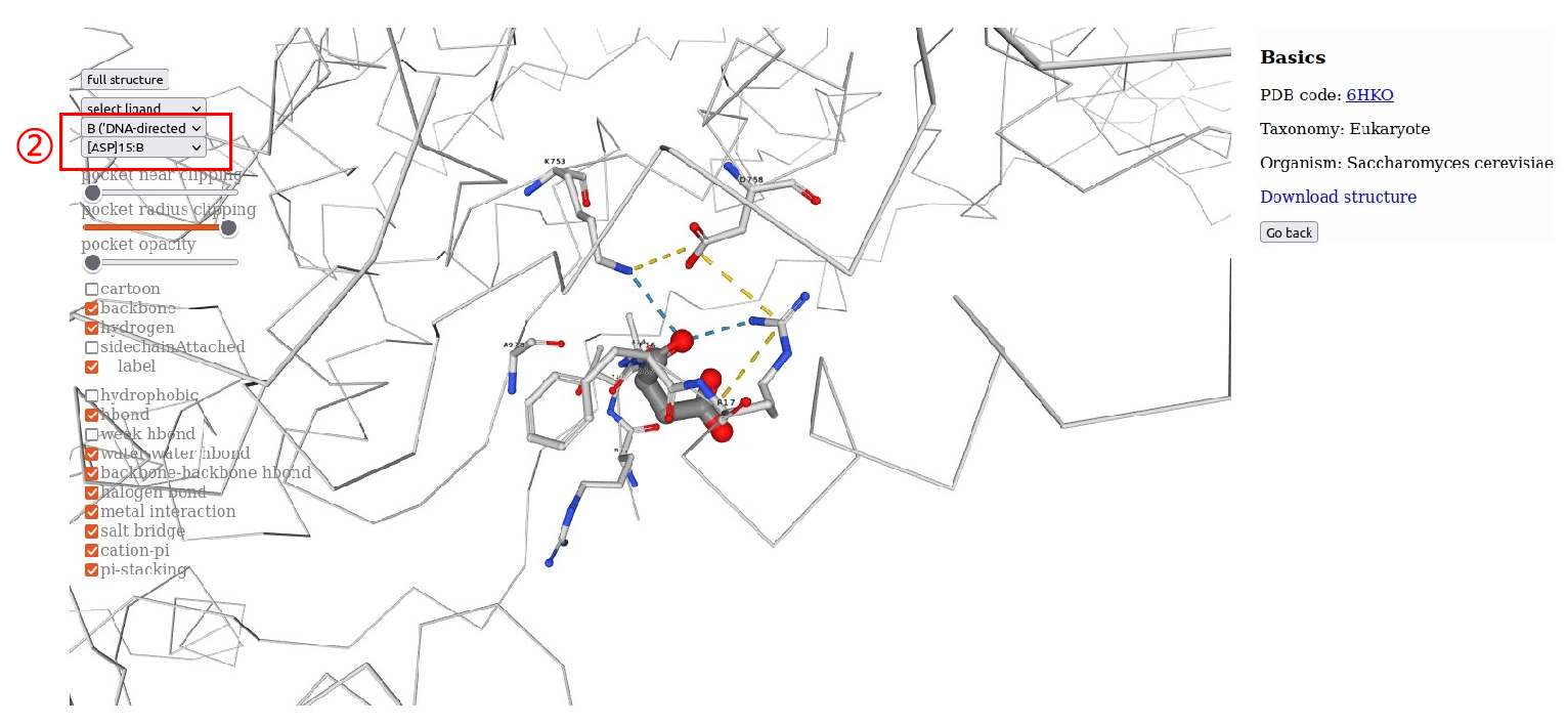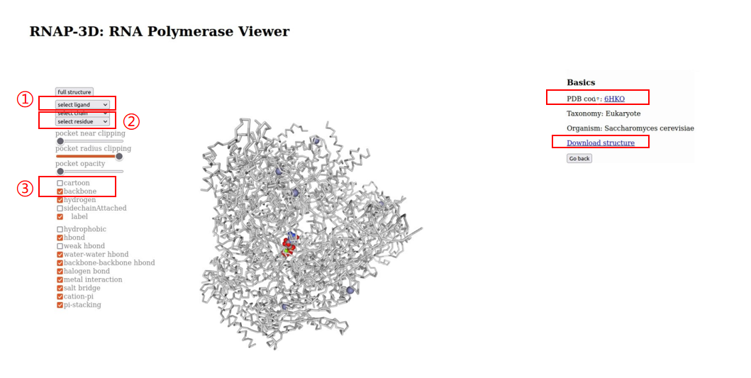 4.RNAP structural information.Users can browse “RNA Polymearase Viewer” page by clicking PDB id,and then display different formats according to their interests. In addition,users can select ligands or residues of different subunits to view their interactions. Users can also click PDB code to view detailed information in PDB database. Alternatively, users can download the PDB file of the polymerase.