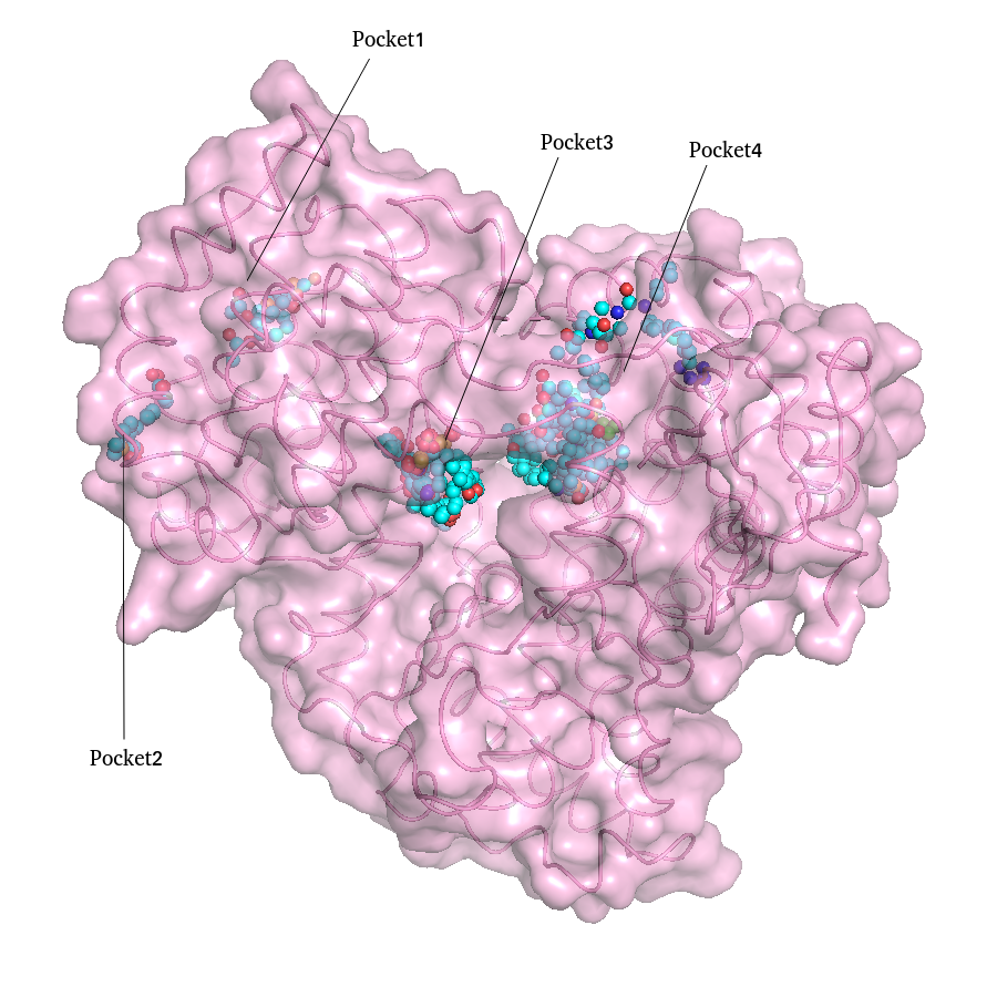 The structures of all RNA polymerases are superimposed, and the pockets where the inhibitors bind intensively are found and numbered pocket 1, pocket 2, pocket 3, etc. A table of inhibitors in each pocket, including inhibitor name, drug name, 2D structure, and 3D visualization.The ID and PDB are linked to PDB database.