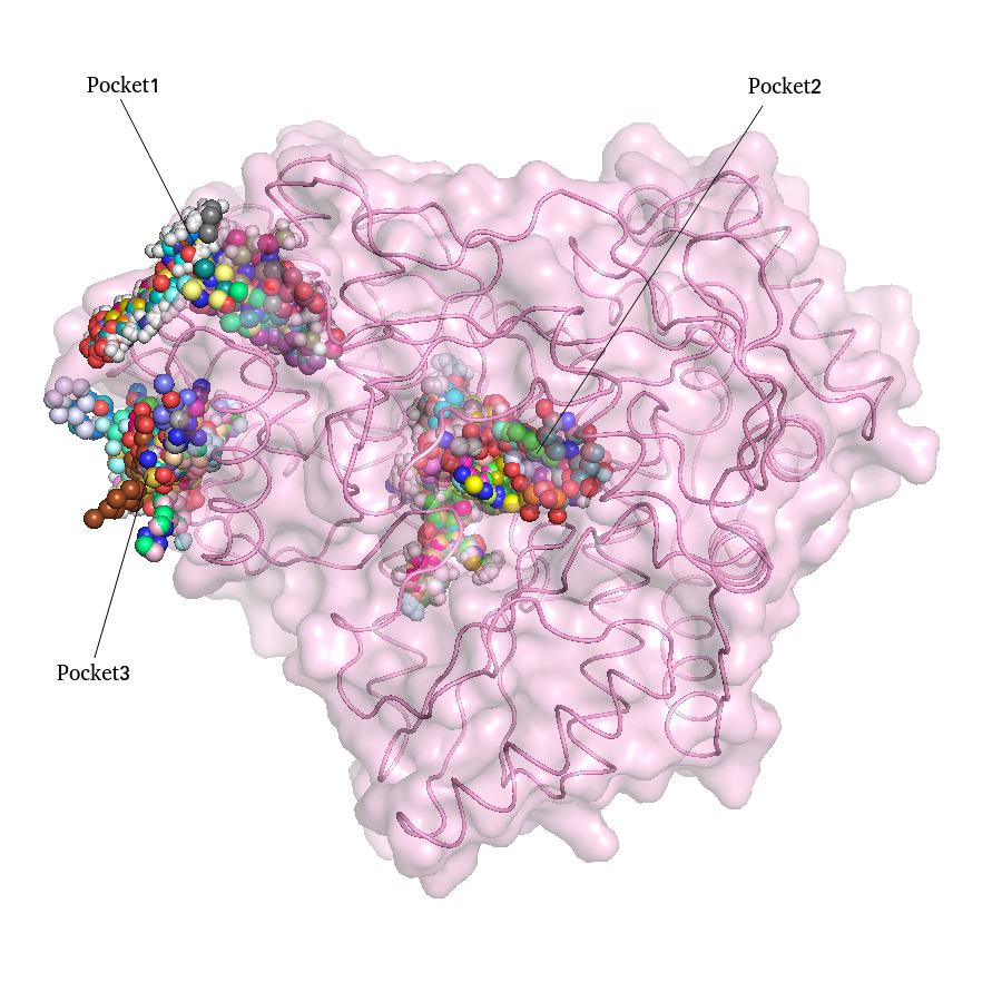 The structures of all RNA polymerases are superimposed, and the pockets where the inhibitors bind intensively are found and numbered pocket 1, pocket 2, pocket 3, etc. A table of inhibitors in each pocket, including inhibitor name, drug name, 2D structure, and 3D visualization.The ID and PDB are linked to PDB database.