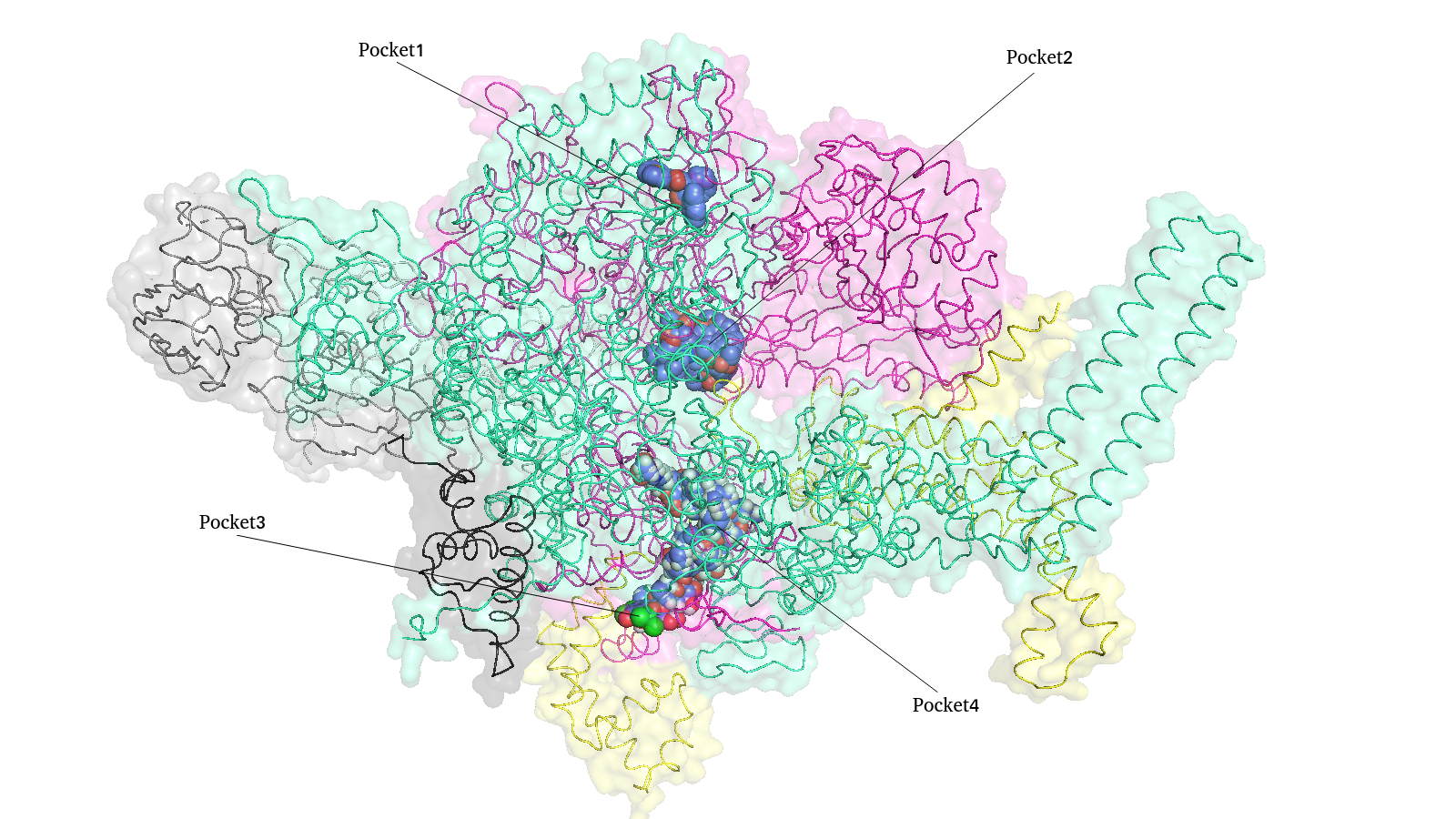 The structures of all RNA polymerases are superimposed, and the pockets where the inhibitors bind intensively are found and numbered pocket 1, pocket 2, pocket 3, etc. A table of inhibitors in each pocket, including inhibitor name, drug name, 2D structure, and 3D visualization.The ID and PDB are linked to PDB database.