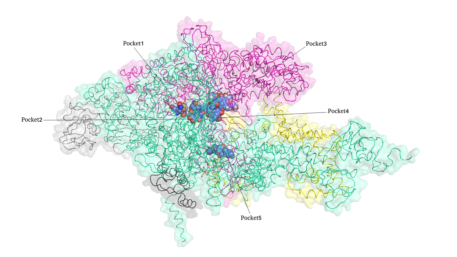 The structures of all RNA polymerases are superimposed, and the pockets where the inhibitors bind intensively are found and numbered pocket 1, pocket 2, pocket 3, etc. A table of inhibitors in each pocket, including inhibitor name, drug name, 2D structure, and 3D visualization.The ID and PDB are linked to PDB database.