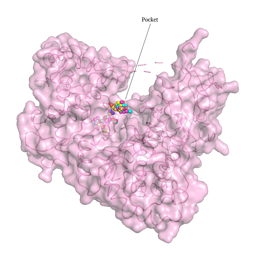 The structures of all RNA polymerases are superimposed, and the pockets where the inhibitors bind intensively are found and numbered pocket 1, pocket 2, pocket 3, etc. A table of inhibitors in each pocket, including inhibitor name, drug name, 2D structure, and 3D visualization.The ID and PDB are linked to PDB database.